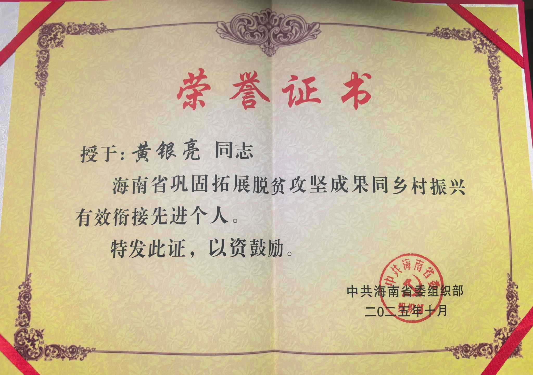 近日,海南经贸职业技术学院教师黄银亮同志荣获"海南省巩固拓展脱贫攻坚成果同乡村振兴有效衔接先进个人"称号。2023年7月至2025年8月,黄银亮以红旗镇镇委副书记(兼),红旗村驻村第一书记、乡村振兴工作队队长的身份,扎根乡土、躬身力行,在琼州的田野乡间谱写了一篇篇饱满而精彩的振兴故事。