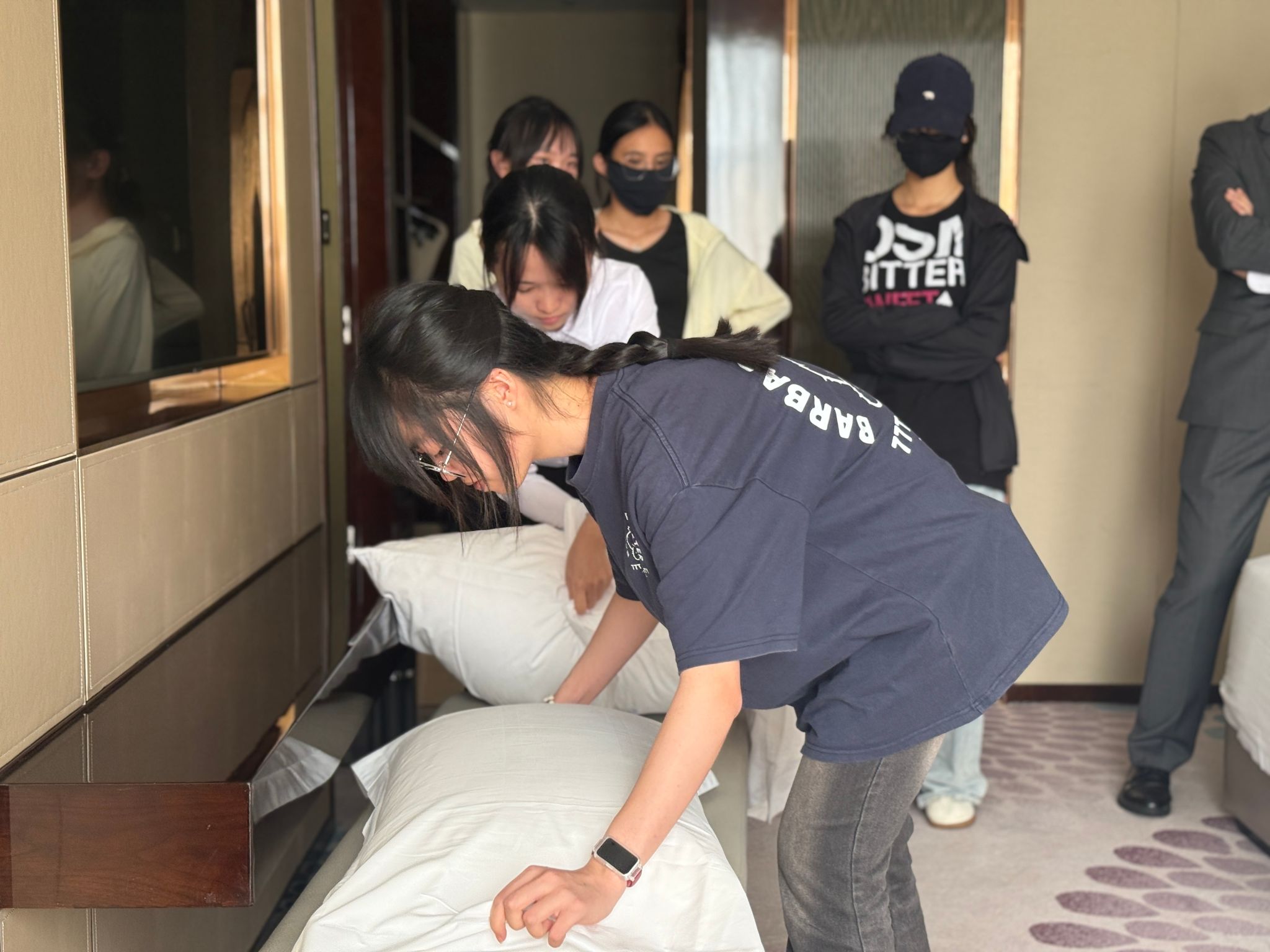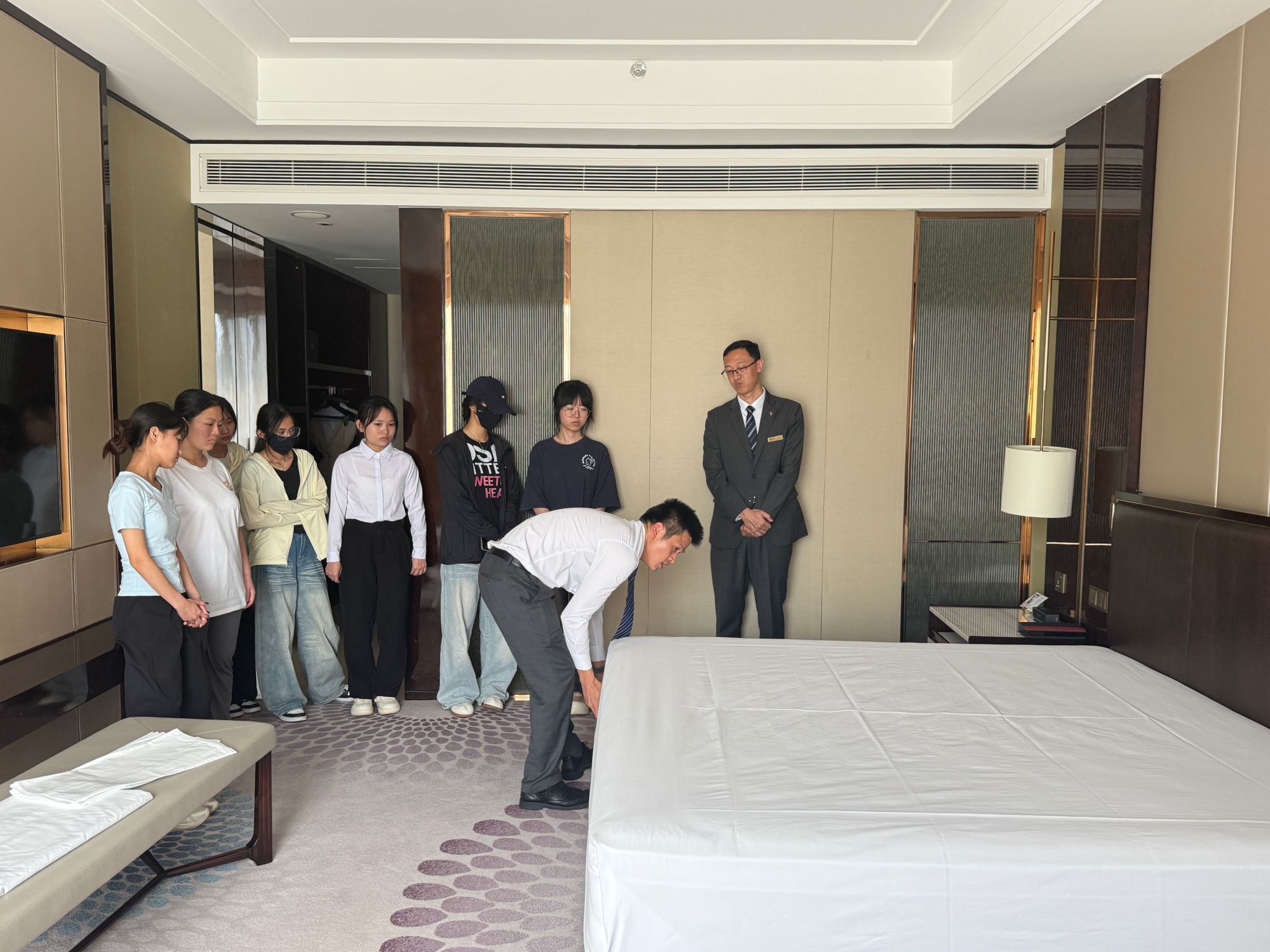 为进一步做好外国语学院与洲至奢选海口亚特酒店“订单班”培养工作,提升学生实践技能,2026年4月7日,学院组织学生到海口亚特酒店学习客房服务操作技能。